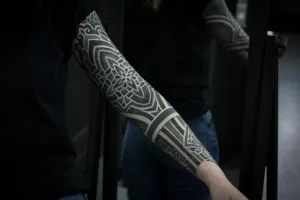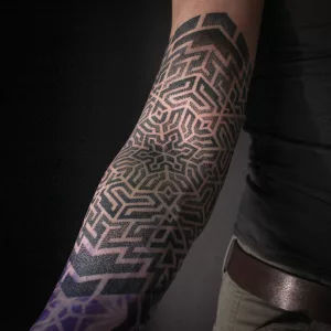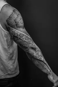 Geometrische Blackwork Tattoos verwenden klare Linien und symmetrische Formen, um faszinierende Muster zu erschaffen. Dieser Stil kann sehr modern und minimalistisch wirken.