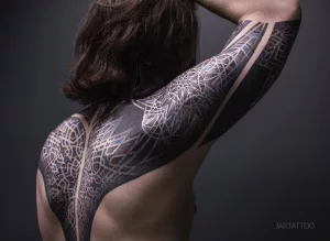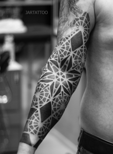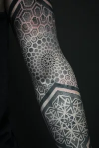 Geometrische Blackwork Tattoos verwenden klare Linien und symmetrische Formen, um faszinierende Muster zu erschaffen. Dieser Stil kann sehr modern und minimalistisch wirken.