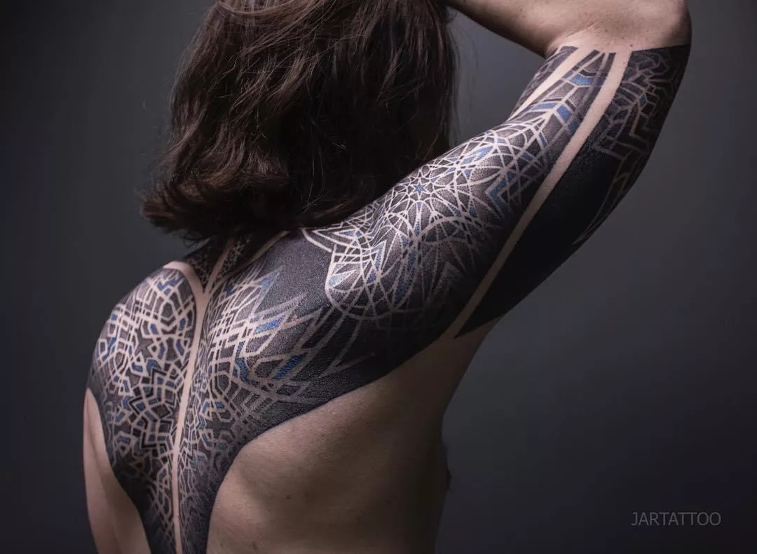 Blackwork Tattoos eignen sich besonders gut für größere Flächen wie Arme, Rücken oder Beine,